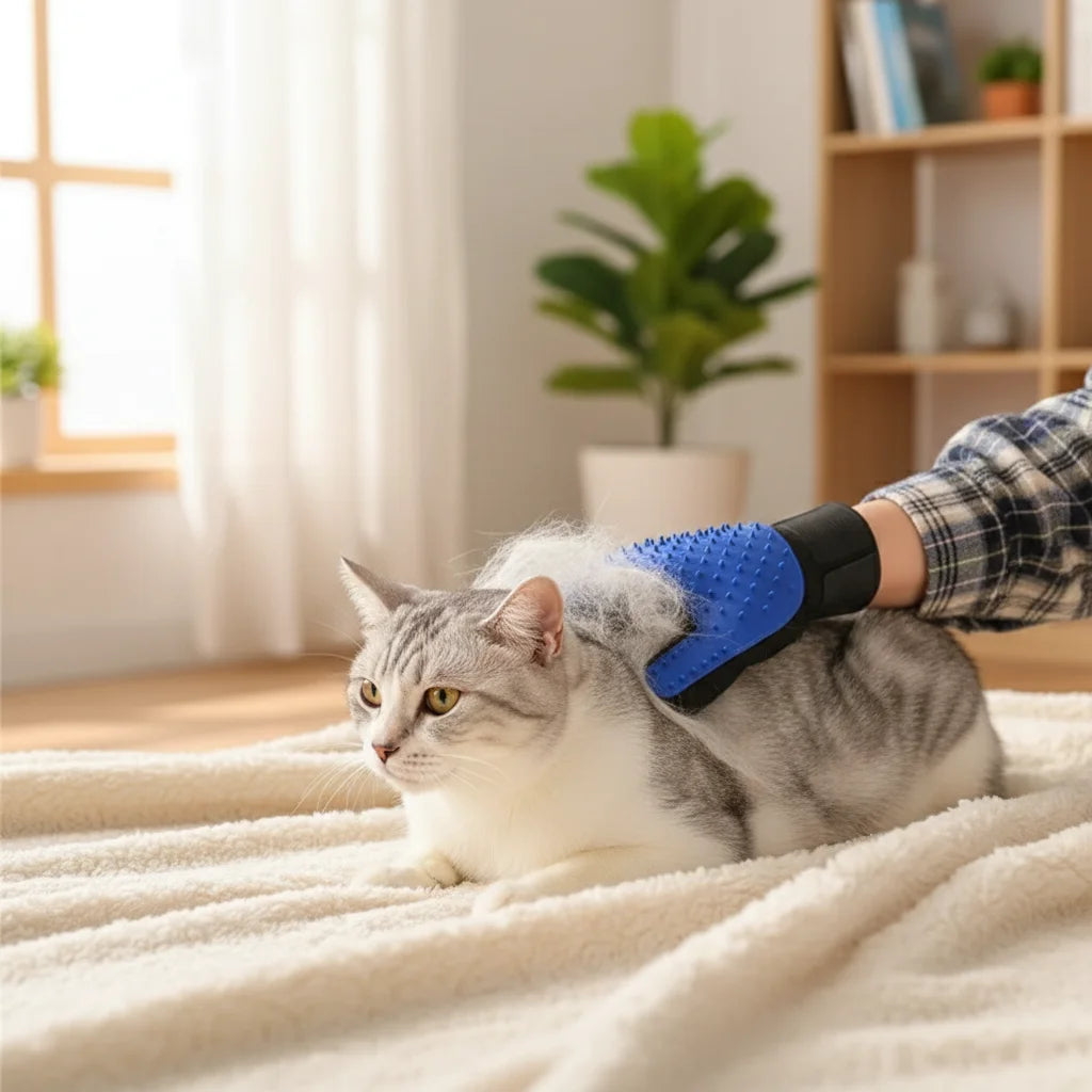 GLOBAL MALL MND Gants de Toilettage Silicone en utilisation avec un chat, éliminant les poils morts.